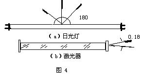 ——普通光源(太陽、白熾燈或熒光燈)向四面八方發(fā)光,或者說,光輻射沿4π立體角分布。它發(fā)出的光輻射可以照亮煙堿周圍的地方,但照亮的距離不大。要把照明的距離擴(kuò)大,可以用光學(xué)系統(tǒng)把各個方向發(fā)射的光聚集到照明的方向,汽車的前車燈、探照燈等就是用這個辦法增大照明距離的。激光器不同,它天性就是只朝一個方向發(fā)射光,而且射出的光束發(fā)散角很小,接近衍射極限,稱得上是高度平行的光束。普通光源和激光器的發(fā)光范圍如圖4所示